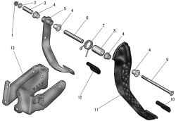 6.2. Педальный узел: 1 – гайка оси; 2 – шайба; 3, 6, 8 – дистанционные втулки; 4 – втулка педали; 5 – педаль тормоза; 7 – возвратная пружина педали сцепления; 9 – ось педалей; 10 – накладка площадки педали сцепления; 11 – педаль сцепления; 12 – накладка площадки педали тормоза; 13 – кронштейн педального узла