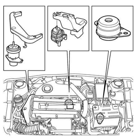 Для крепления двигателя используется три опоры, из которых задняя и правая – гидравлического типа (см. описание для 4-цилиндровых двигателей).