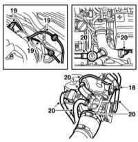 - Отсоедините от корпуса дросселя вакуумный шланг, 2 шланга системы охлаждения, подающую и перепускную трубки. Разъедините разъём корпуса дросселя и отсоедините шланг клапана продувки снизу корпуса дросселя (20 на иллюстрации).