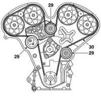 - Отдайте крепёж ролика натяжителя ремня привода ГРМ и регулировочные ролики. Используйте специальное приспособление для фиксации регулировочных роликов (29 на иллюстрации