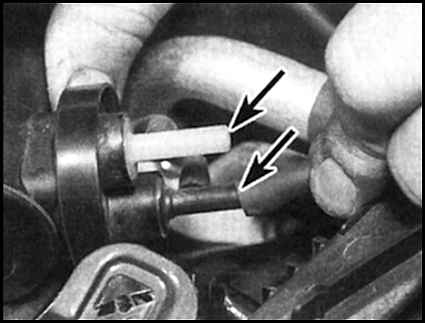 затем отсоедините тросик от сектора дросселя и высвободите его из держателя.