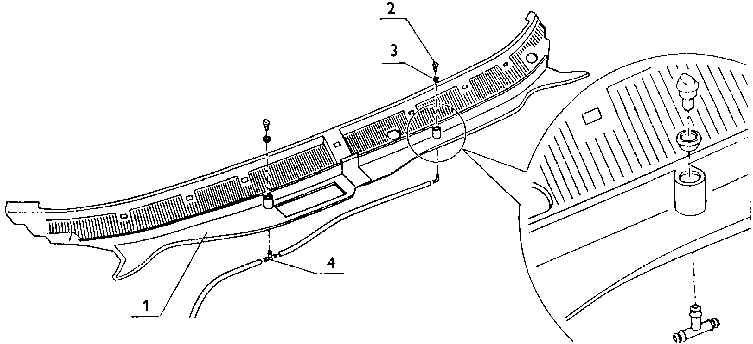 Две форсунки смывателей лобового стекла сдвоенные. В пластмассовом держателе каждой форсунки находятся два стальных шарика для разбрызгивания омывающей жидкости. Направление потоков жидкости регулируется иглой, вставленной в отверстия шариков. Форсунки в сборе вставляются в резиновые втулки, вделанные в пластмассовую крышку разделяющей перегородки (см. рис. Монтаж омывателей лобового стекла).