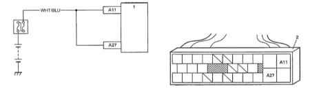 Проверьте контакт провода "BLK/WHT" с 1-выводным (модель с откидным верхом) или 20-выводным (помимо модели с откидным верхом) разъемом комбинированного счетчика.