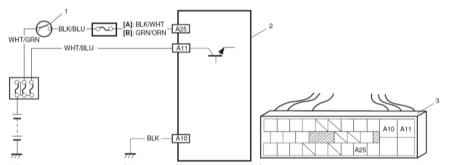 Если контакт в порядке, затем включите переключатель зажигания и измерьте напряжение между выводом "BLK/WHT" (модель с откидным верхом) или выводом "GRN/ORN" (помимо модели с откидным верхом) разъема сенсора и корпусом/землей. Напряжение равно 10-14 В?