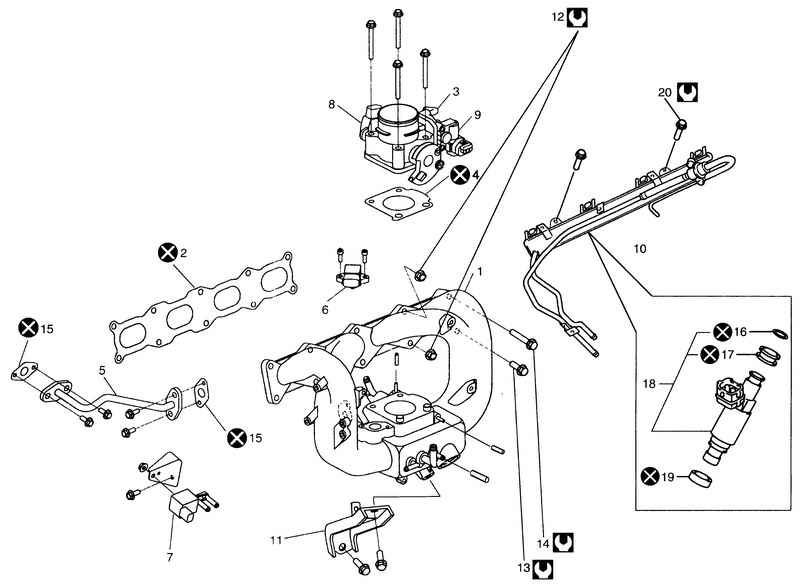 Рис. 2.44. Детали дроссельного патрубка и впускного коллектора: 1 – впускной коллектор; 2 – прокладка впускного коллектора; 3 – дроссельный патрубок; 4 – прокладка; 5 – трубка рециркуляции отработавших газов; 6 – датчик абсолютного давления во впускном коллекторе; 7 – клапан продувки фильтра системы улавливания паров бензина; 8 – датчик положения дроссельной заслонки; 9 – регулятор холостого хода; 10 – труба подачи топлива; 11 – элемент жесткости впускного коллектора; 12 – гайка крепления впускного коллектора; 13 – болт крепления впускного коллектора (короткий); 14 – болт крепления впускного коллектора (длинный); 15 – прокладка трубки системы рециркуляции отработавших газов; 16 – уплотнительное кольцо; 17 – уплотняющее кольцо; 18 – блок топливной форсунки; 19 – прокладка; 20 – болт крепления трубы подачи топлива