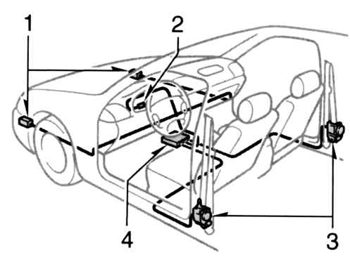 Система преднатяжителей ремней безопасности передних сидений состоит из следующих основных компонентов, расположение которых показано на рисунке 1.102: