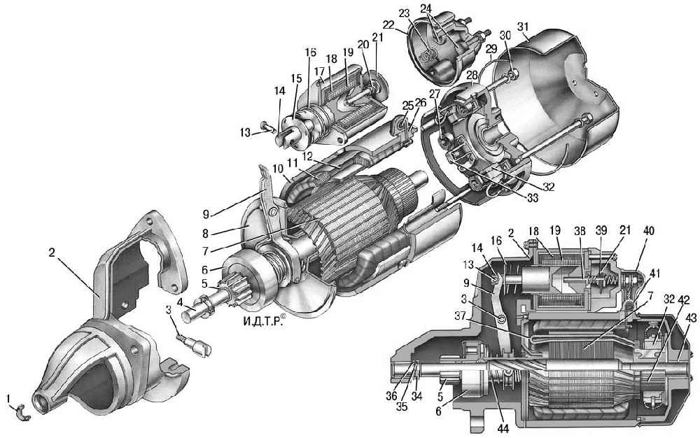 Рис. 10.5. Стартер 42.3708: 1 – заглушка; 2 – крышка со стороны привода; 3 – ось рычага; 4 – вал ротора; 5 – шестерня привода; 6 – привод стартера; 7 – ротор; 8 – промежуточная опора; 9 – рычаг привода; 10 – корпус; 11 – обмотка статора; 12 – полюс; 13 – заклепка; 14 – якорь тягового реле; 15 – опорная шайба пружины; 16 – пружина якоря реле; 17 – корпус тягового реле; 18 – удерживающая обмотка; 19 – втягивающая обмотка; 20 – пружина; 21 – контактный диск; 22 – крышка тягового реле; 23 – пружина; 24 – контактный болт; 25 – вывод; 26 – изоляционная втулка; 27 – пружина щетки; 28 – крышка со стороны коллектора; 29 – уплотнительное кольцо; 30 – стяжной болт; 31 – защитный кожух; 32 – щетка; 33 – держатель щетки; 34 – упорное кольцо; 35 – стопорное кольцо; 36 – упорная шайба; 37 – обмотка ротора; 38 – плунжер якоря реле; 39 – изоляционная втулка; 40, 41 – защитные колпаки; 42 – коллектор; 43 – втулка вала ротора; 44 – буферная пружина
