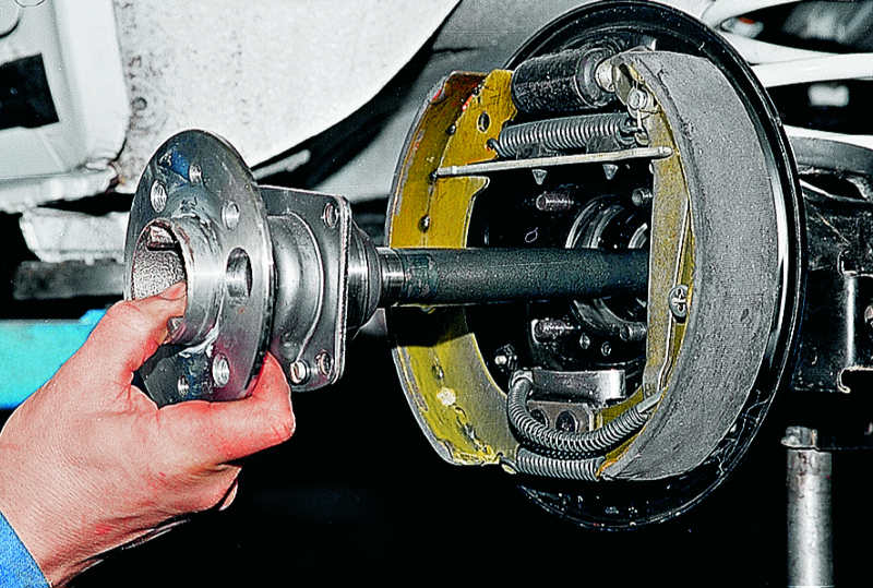 Полуось вынимается вместе с маслоотражателем, пластиной крепления, подшипником и запорным кольцом.