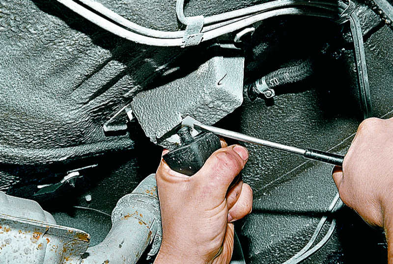 При необходимости проведения ремонта кузова или замены кронштейна крепления продольной нижней штанги к кузову отворачиваем головкой “на 19” четыре гайки и снимаем кронштейн.