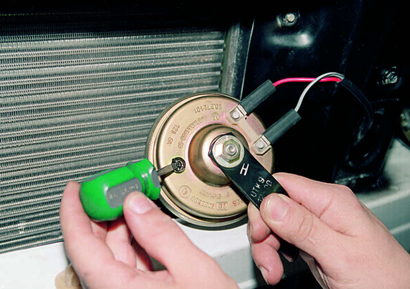 При нажатой кнопке сигнала на рулевом колесе отверткой плавно вращаем регулировочный винт, добиваясь чистого и громкого звука. Если регулировкой не удается устранить хрипы, меняем звуковой сигнал.