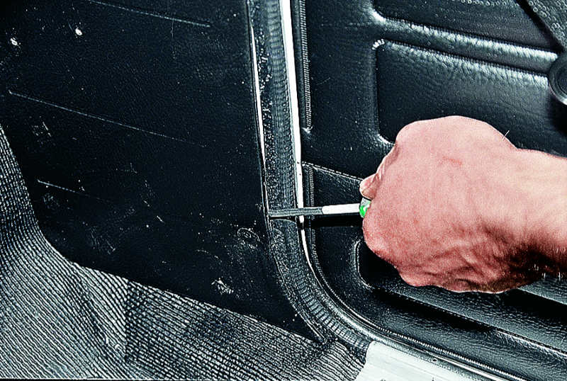 ...и снимаем обивку боковины. Остатки кнопок выдергиваем плоскогубцами.