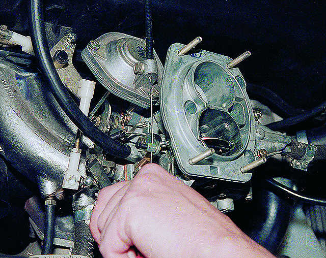 Ослабляем трос привода воздушной заслонки (см. Замена карбюратора). В салоне автомобиля утапливаем рукоятку управления воздушной заслонкой до упора.