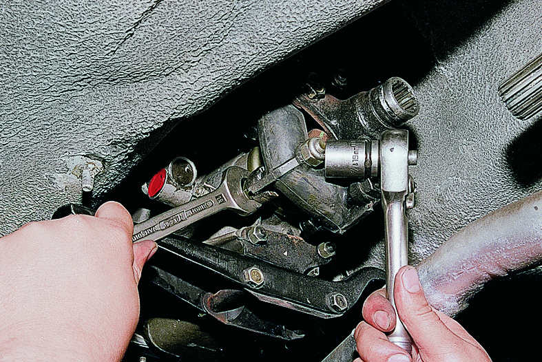 ...головкой «на 13» отворачиваем две гайки крепления поперечины к кузову и опускаем заднюю часть коробки до упора.