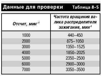 Тахометр проверяется на стенде, имитирующем систему зажигания автомобиля. Присоединив тахометр к схеме стенда так же, как на автомобиле, установите напряжение в первичной цепи 14 В и зазор в разряднике стенда 7 мм. Вращайте валик распределителя зажигания с такой скоростью, чтобы стрелка тахометра дошла до одного из делений шкалы. В этот момент проверяйте, чтобы частота вращения валика распределителя находилась в пределах, указанных в табл. 8–5.