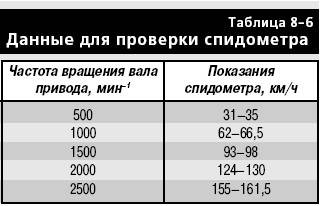 Проверку спидометра производите, сравнивая его показания с эталонным. Данные для проверки приведены в табл. 8–6.
