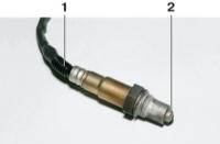 Датчик кислорода двигателей ВАЗ-21114 и ВАЗ-21124 внешне отличается от предыдущей модели гофрированным уплотнителем (1) и формой наконечника (2) с отверстиями