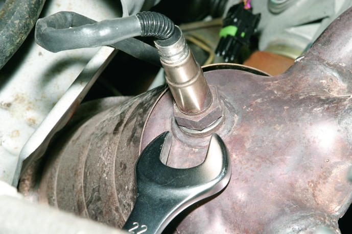 Показано снятие датчика кислорода, установленного в верхней части катколлектора.
