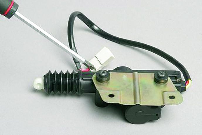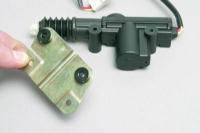 - Отсоединяем наконечник электропривода от тяги привода замка двери и вынимаем электропривод со жгутом проводов из полости двери.