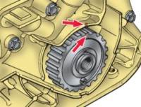 Вложите в гнезда на передних концах коленчатого и распределительного валов сегментные шпонки и установите зубчатые шкивы. Заблокировав шкив распределительного вала от проворачивания, закрепите его болтом с шайбой.