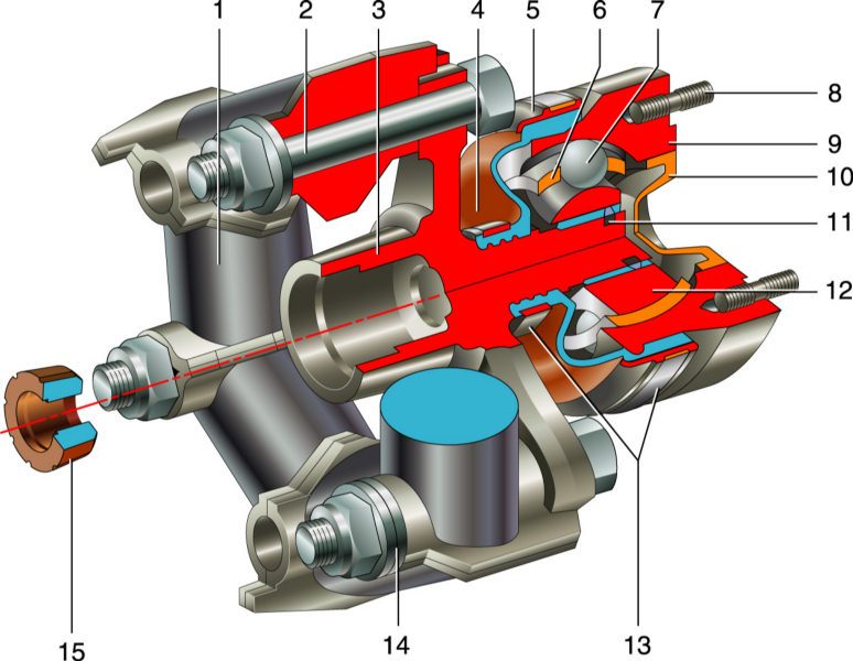 9 – корпус шарнира; 10 – заглушка; 11 – стопорное кольцо; 12 – обойма шарнира; 13 – хомуты; 14 – балансировочная шайба; 15 – центрирующая втулка.