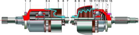 9 – защитный чехол; 10 – сепаратор; 11 – упорное кольцо обоймы; 12 – шарик; 13 – обойма наружного шарнира; 14 – стопорное кольцо; 15 – корпус наружного шарнира.