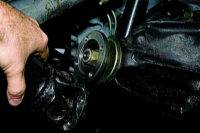 Вставив мощную отвертку между болтами, удерживаем фланец от проворачивания, а головкой «на 24» отворачиваем гайку крепления фланца.