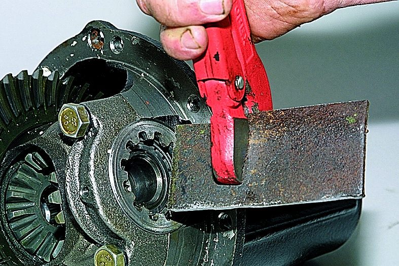 Зажав коробку дифференциала в тиски с накладками губок из мягкого металла,…