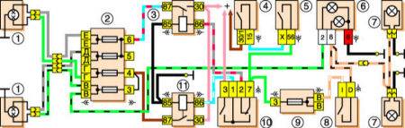 На автомобиле установлены две круглые фары головного света. Лампы фар – двухнитевые (Н4). Напряжение на нити ламп подается через реле ближнего и дальнего света типа 113.3747, расположенные под панелью приборов с левой стороны. Характеристики реле: напряжение включения при температуре (20±5)°С – не более 8 В, сопротивление обмотки – (85±8,5) Ом. Напряжение на обмотки реле подается, если полностью нажата клавиша переключателя наружного освещения (тогда выбор между ближним и дальним светом – в зависимости от положения подрулевого переключателя света фар) или независимо от положения переключателя – если водитель оттягивает на себя левый подрулевой переключатель (включается дальний свет фар).