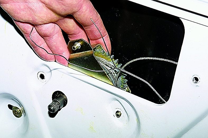 Продеваем вал механизма стеклоподъемника в отверстие внутренней панели двери (новый механизм стеклоподъемника продается со связанными ветвями троса).