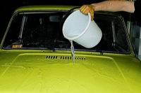 Для того, чтобы смыть рыхлую грязь и дорожную пыль, обливаем автомобиль водой из ведра…