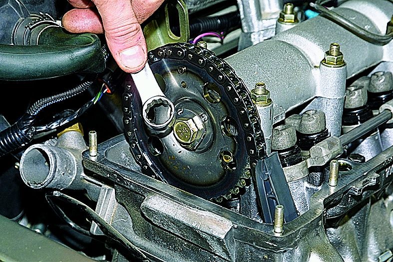 Накидным ключом «на 17» отворачиваем болт крепления звездочки распределительного вала.