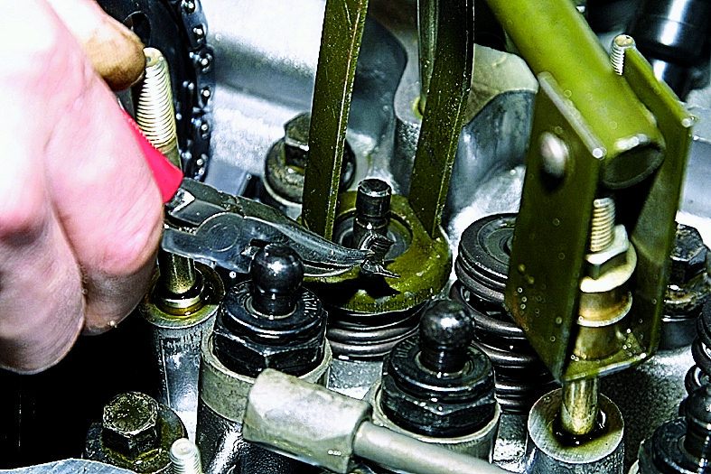 Подпятник рассухаривателя упираем в тарелку клапана, а зацепной рычаг заводим за гайку, навернутую на шпильку крепления корпуса подшипников распределительного вала.