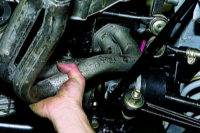 Отсоединяем от приемной трубы на автомобиле ВАЗ-21213 дополнительный глушитель (см. Снятие дополнительного глушителя) или на автомобиле ВАЗ-21214 каталитический нейтрализатор (см. Снятие нейтрализатора).