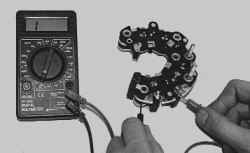 9. Если тестер покажет низкое или близкое к нулю сопротивление, то диод «пробит», если показание тестера будет стремиться к бесконечно большому сопротивлению независимо от цвета подсоединенных щупов, то диод «в обрыве». И в том и в другом случае выпрямительный блок подлежит замене.