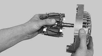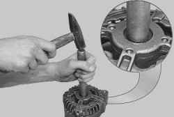 19. Извлеките вал ротора из подшипника. При необходимости навинтите на вал ротора гайку крепления шкива и через деревянную проставку легкими ударами молотка выпрессуйте вал ротора из подшипника.