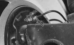 6. Осмотрите соединения шланга с подводящей трубкой и колесным цилиндром, а также штуцер для выпуска воздуха тормозных механизмов передних...