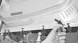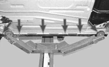 4.5.16. Прочистка дренажных отверстий кузоваВо время эксплуатации в полостях порогов и дверей скапливается влага, вызывающая коррозию. Эта влага удаляется через дренажные отверстия, расположенные снизу порогов и дверей. Дренажные отверстия постоянно забиваются грязью, поэтому рекомендуется их ежегодная очистка. При эксплуатации автомобиля на проселочных дорогах проводите эту операцию чаще.