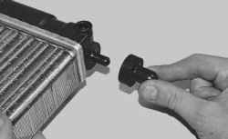 16. Установите радиатор в порядке, обратном снятию, предварительно надев на штифты радиатора подушки нижнего крепления и вставив в кронштейны втулки верхнего крепления.
