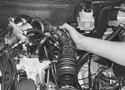 3. Отсоедините от катколлектора приемную трубу дополнительного глушителя, для чего отверните гайки крепления фланца приемной трубы к фланцу катколлектора и снимите фланец приемной трубы со шпилек фланца катколлектора (см. «Замена дополнительного глушителя»).