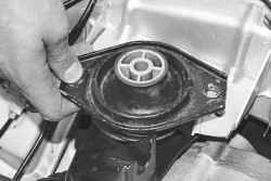 13. Отверните ключом «на 17» гайку крепления подушки передней опоры к кронштейну и выверните ключом «на 13» два болта крепления подушки к кузову. Снимите ограничители подушки и саму подушку.
