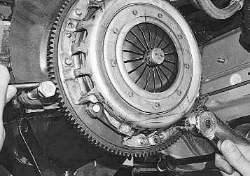 4. Удерживая маховик отверткой от проворачивания, выверните шесть болтов крепления кожуха нажимного диска сцепления к маховику. Затяжку болтов ослабляйте равномерно: каждый по одному обороту ключа, переходя от болта к болту по диаметру.