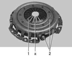 10. Внешним осмотром оцените состояние тарельчатой пружины 1 нажимного диска. Наличие трещин на пружине не допускается. Места а контакта лепестков пружины с подшипником выключения сцепления должны находиться в одной плоскости и не иметь явных следов износа (износ не должен превышать 0,8 мм). В противном случае замените нажимной диск в сборе. При ослаблении заклепочных соединений 2 деталей кожуха и нажимного диска замените нажимной диск в сборе.