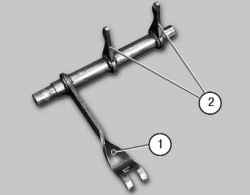6. Замените вилку выключения сцепления, если погнулся либо треснул рычаг 1 вилки или сильно изношены лапки 2 вилки в местах контакта с муфтой подшипника.