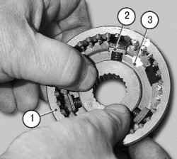 2. Перед разборкой промаркируйте положение муфты 3 относительно ступицы 1. Разберите аккуратно синхронизатор, сняв муфту со ступицы. При этом следите за тем, чтобы подпружиненные сухари 2 с шариками не разлетелись в разные стороны.