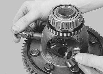 6. Вставив зубило в зазор между торцом внутреннего кольца подшипника и коробкой дифференциала, спрессуйте ведомую шестерню с корпуса дифференциала.