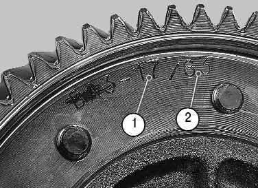 8. Проверьте состояние ведомой шестерни коробки передач. При наличии сколов, выкрашиваний и значительной выработки зубьев замените шестерню. На ведомой шестерне выбито число зубьев ведущей 1 и ведомой 2 шестерен.