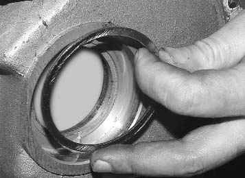 11. Выпрессуйте наружные кольца из картеров коробки передач и сцепления специальным съемником. Если съемника нет, выпрессуйте сначала сальники полуосей. Учтите, что в этом случае сальники повреждаются и их надо заменить (см. «Замена сальников коробки передач»). С наружной стороны картеров выпрессуйте бородком кольца подшипников.
