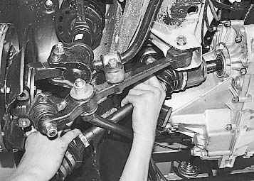 Перемещению амортизаторных стоек препятствуют рулевые тяги. Для того чтобы исключить их влияние, при отсоединении от ступицы левого привода выверните рулевое колесо до упора вправо, а при отсоединении правого привода — влево.